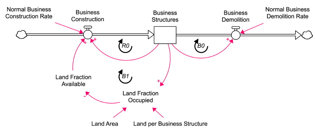 The model explains how growth is limited due to constraints on carrying capacity. It has one stock and at least two loops, the growth loop and the limits loop. I use an example of the growth of business structures with three loops