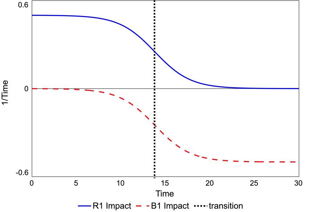 Although the first region has loop R1 dominating behaviour, Figure 3 shows that both loops are always affecting the acceleration of the stocks. Near the transition point, the two loops have similar impacts, and their combination means that acceleration is slight.