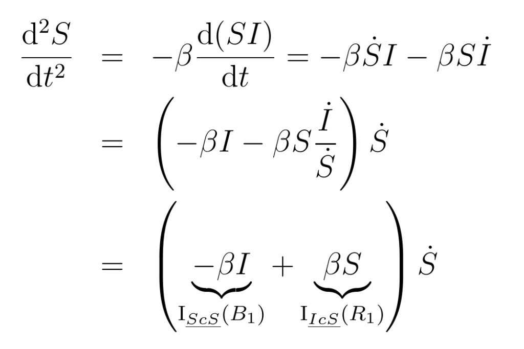 The system is one-dimensional due to the conserved flow in Figure 1. Thus, S is determined by algebra from I. The equations give S + I = N, where N is the total population. Differentiating the S equations gives its impacts (Hayward & Boswell, 2014; Hayward & Roach, 2017):