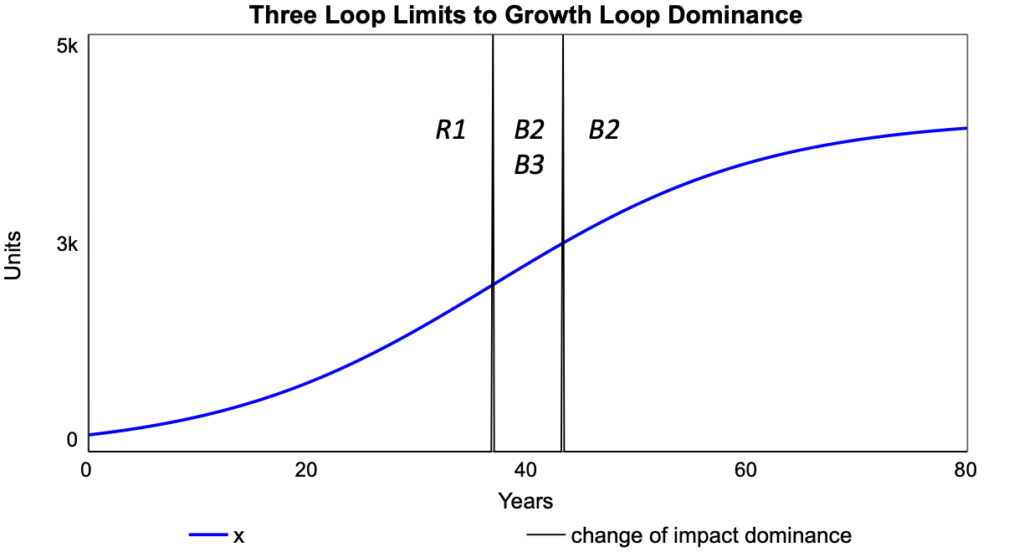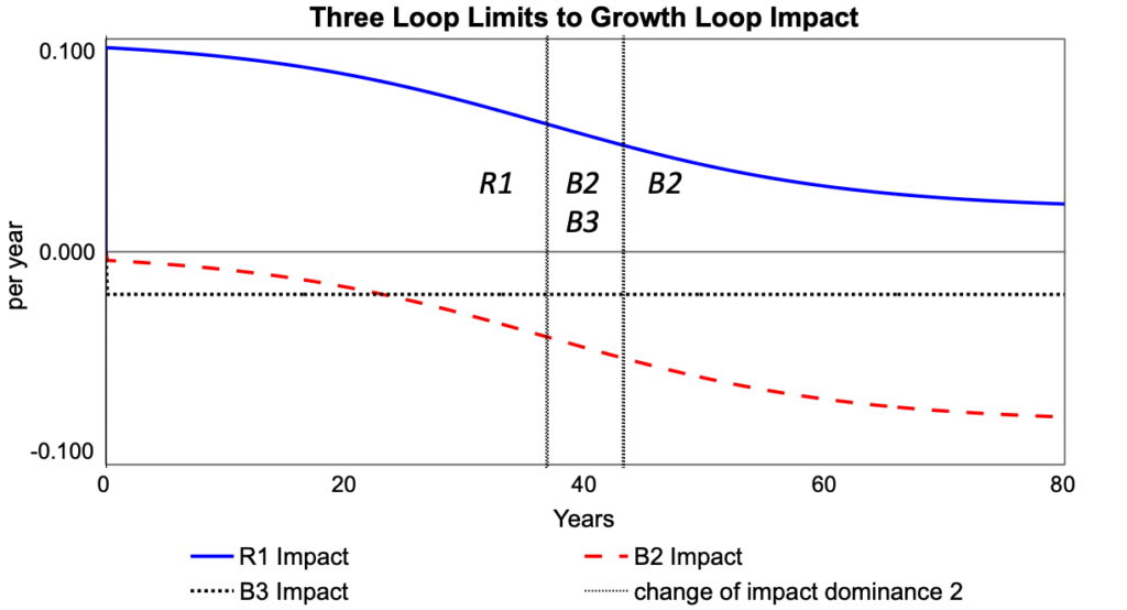 The first change in dominance occurs when the sum of the impacts of two balancing loops exceeds that of R1 in magnitude, as shown in the middle region of Figure 2. now changes from accelerating to decelerating, as shown in Figure 3. Once the impact of B2 increases sufficiently in magnitude, the deceleration is dominated by B2 alone, as shown in the right-hand region of Figures 2 and 3.