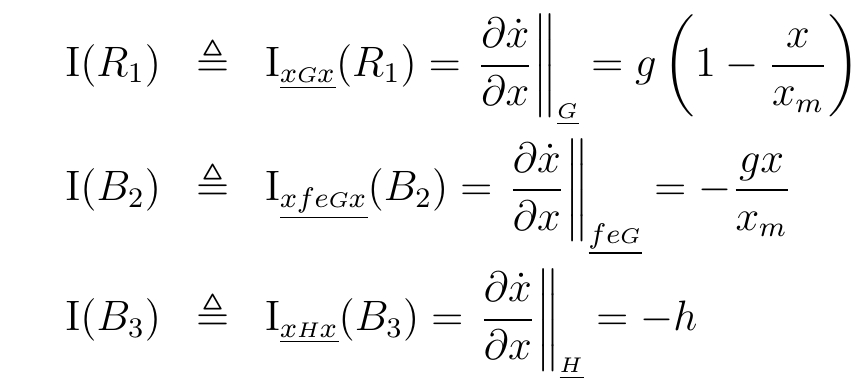 The underlined subscripts indicate the causal pathways from the variable x on the right-hand side to itself (the left-hand side). Thus, R1 is via the flow . By contrast, B2 is via the sequence . B3 is via . This causally connected differential equation contains all the model information, equations, feedback loops and causal connections. The variable sequence can be derived mathematically from the original equation set in Figure 1, see references [1,2].